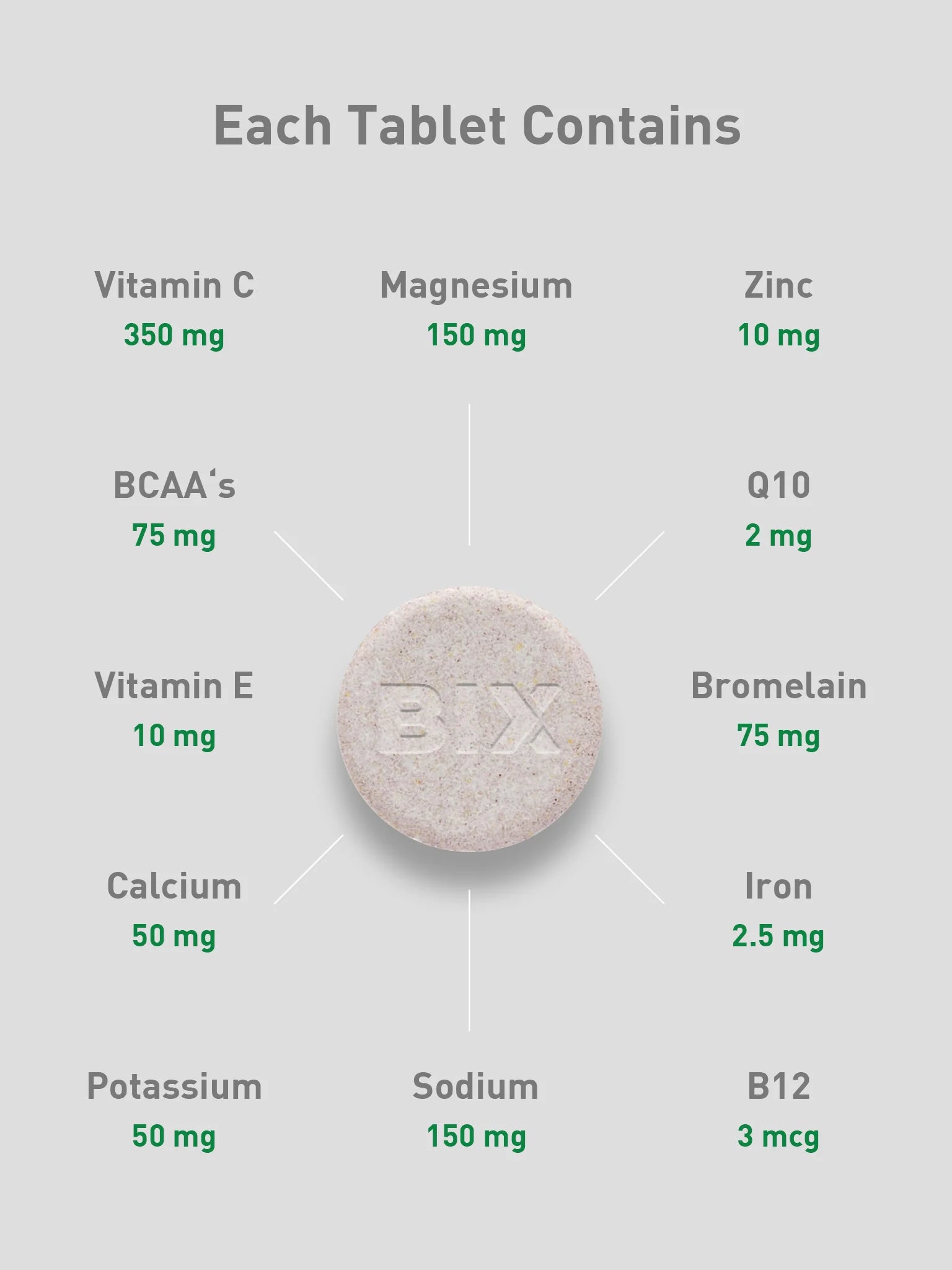 VITAMIN C (L-ascorbic acid), MAGNESIUM (Magnesium carbonate), SODIUM (Sodium hydrogen carbonate), Branched-chain AMINO ACIDS (BCAA's), BROMELAIN Powder, POTASSIUM (potassium hydrogen carbonate), CALCIUM (Calcium carbonate, tricalcium phosphate), ZINC (Zinc citrate), VITAMIN E (DL-α-tocopheryl acetate), COENZYME Q10, IRON (Ferrous gluconate), B12 (Cyanocobalamin), SELENIUM (Sodium selenate), Natural colours & flavours, Sucralose, RED BEET JUICE POWDER
